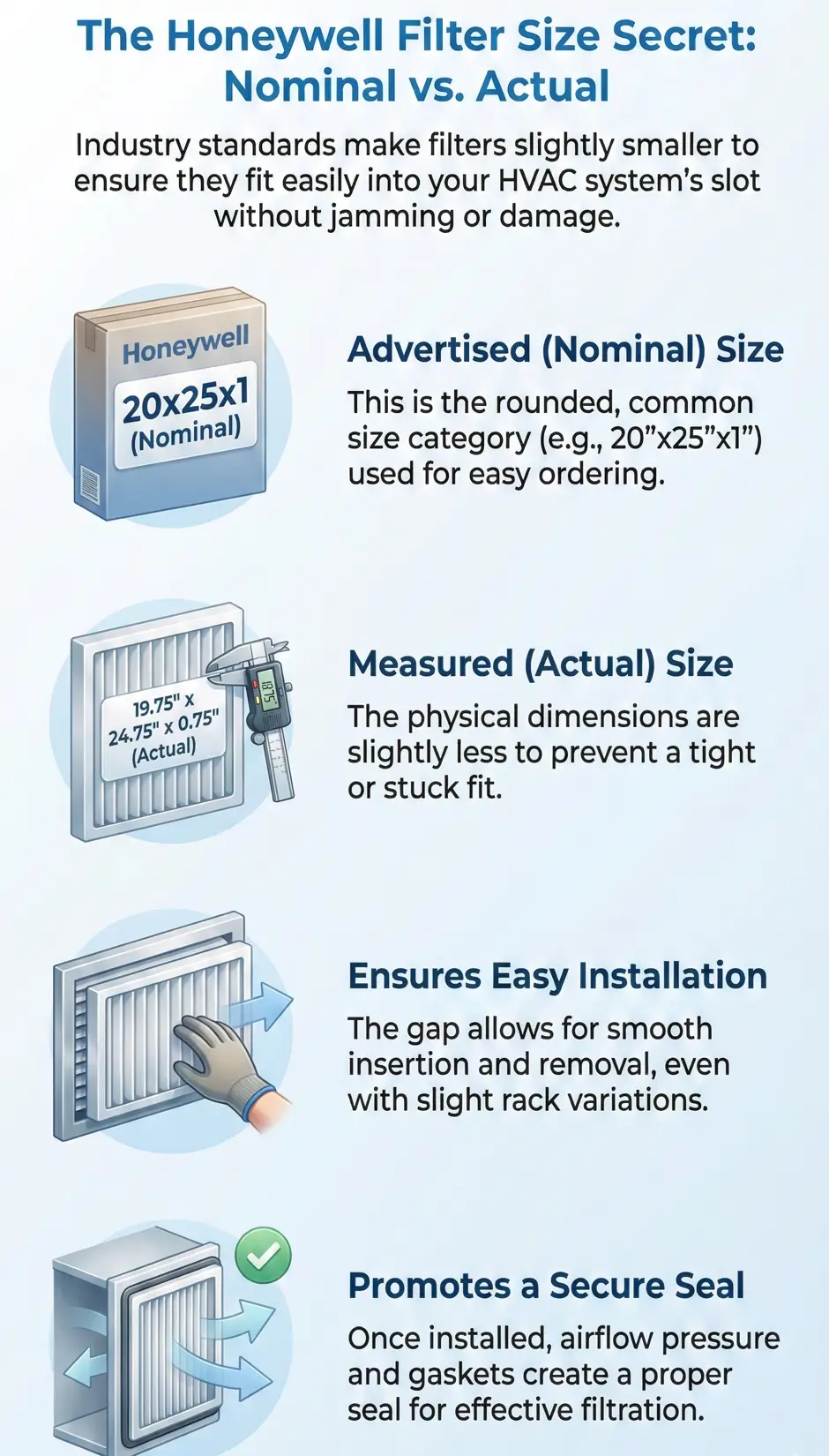 Your Honeywell filter isn't defective. The printed size is "nominal"—an industry-standard rounding convention. A 20x25x1 filter is designed to measure approximately 19½ x 24½ x ¾ inches. That undersize is intentional.