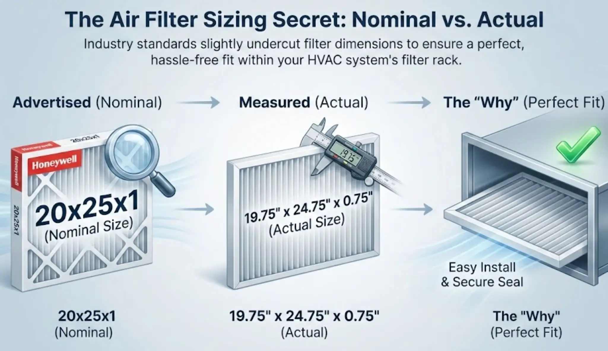 The undersizing serves a practical purpose. Filters need to slide in and out of their housing without requiring force. That small clearance gap allows homeowners to change filters quickly without bending frames or tearing filter media.